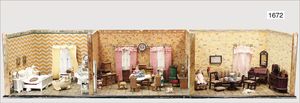 3-teilige Puppenstube, ca. 1920, 1,74 m breit, 39 cm hoch, Fenster, Durchgangstüren, schöne Orig.-Tapete, möbliert, Wohn-, Schlaf- und Esszimmer, mit Puppenstubenpuppen, Celluloid, kl. Uhr, Messingblech vergoldet, Deckelhalter, ELASTOLIN-Papagei an der Stange