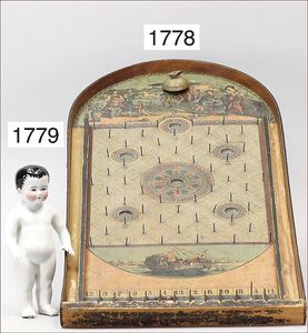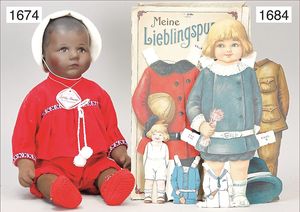 "Meine Lieblingspuppe", (Anziehpuppe), Kleider und Hüte, Junge, bunt lithogr. Orig.-Kart., stark verschlissen, 36 cm hoch, ca. 1910