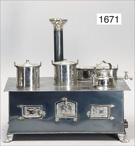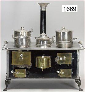 Puppenküchen-Herd, 44 cm breit, Topfsatz vernickelt, Wasserschiff, Kessel, 2 Töpfe, 1 Topf fehlt, Löwentatzenfüße, mit Brenner