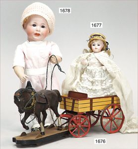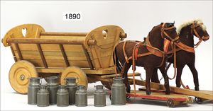 gr. Holzpferd m. Gussspeichenrädern, mit Griffstange, Glasaugen, Mähne Pferdehaar, Griffstange u. Bodenplatte 1 x überstrichen, Höhe m. Griffstange 86 cm