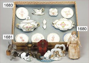Puppenstuben-Speiseservice, um 1900, Suppenterrine, 11 cm, Sauciere, Salz und Pfeffer, 6 Teller, Anbietschalen, Blumendekor, mit Goldrand, ausgef., schöner Orig.-Zust., mit lithogr. Deckbild