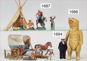 Ranger-Lodge, Fort, Holz, im Orig.-Kart., Holzhaus, mit Holzquadrat, Eingangstor, Klapptüren, 3 Holzwände, dazu 2 Wigwam-Zelte, 12 Masse-Figuren, Indianer, ungemarkt, Lagerleben, 2 Trapper, ELASTOLIN, Kunststoff, 1 paar Kunststoff-Figuren, Hersteller ?, 1 Planewagen, 26 cm, Masse-Pferd, Kutscher, sehr guter Zust., 1 ELASTOLIN-Ranger, mit Gewehr