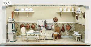 Puppen-Küche, 96 cm breit, 42 cm hoch, 48 cm tief, ca. 1910, alte Tapete an Wand und Boden, alte Bemalung, möbliert, teilw. schönes Zubehör, Porzellanteile, Kupferteile, darunter Kupfer-Backform Hummer, dazu 1 Paar Kupferteile neuer, Herd 50er Jahre