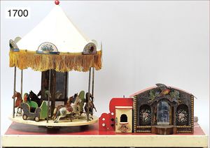 Karussell, mit Grammophonmotor und Grammophon, um 1920, wohl ERZGEBIRGE, zum Aufziehen, beim Drehen des Karussells erscheint gleichzeitig die Melodie der Schallplatte, Gramophon-Motor techn. überholt, uralte elektrifizierte Beleuchtung des Karussells, 12 V, funktionsfähig, kleine Dame, dreht sich beim Spielen des Karussells, Masse-Pferde mit Holzbeinen, Stoffborten, Posamenten, 2 Schelllackplatten, Kurbel und Nadeln