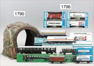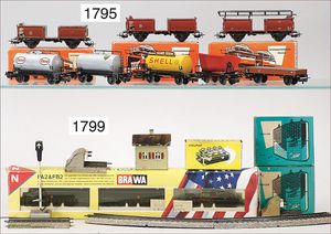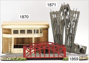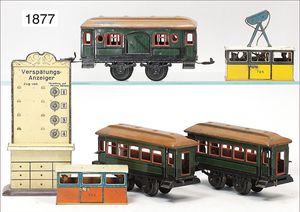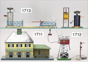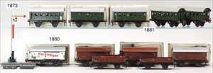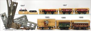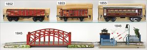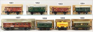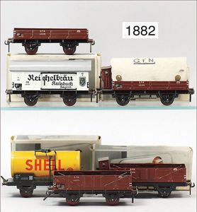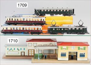 KIBRI Bahnwärterhäuschen, dazu 6 Güter- und Personen-Wagen, einfach, wohl KARL BUB und andere, bespielt, teils nicht komplett