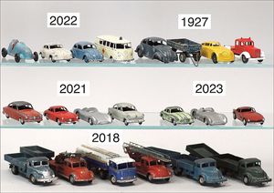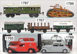 MÄRKLIN Restaurierungsmaterial, Käfer, Brezelfenster, Nr. 9, Fragment, Zinkpest, 1 LKW, Feuerwehr nicht komplett, übermalt, wohl Zinkpest, Fragment eines Anhängers, 1 x Stromlinienwagen, restauriert