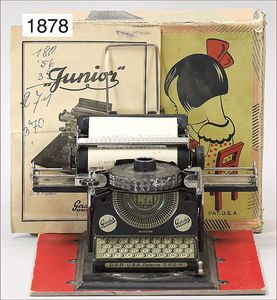 alte Kinderschreibmaschine, ungemarkt, auf Funktion nicht überprüft, Sockelmaß 23 cm x 12,5 cm, mit Haube