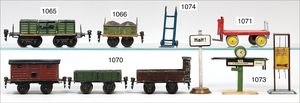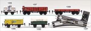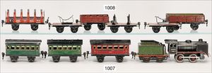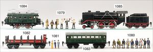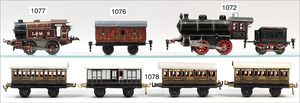 Fundkiste, KWN, 4 x 4-achsige Personenwagen, 1 x Gepäckwagen, dazu 1 Kipplore, 1 Weinfasswagen, sowie 1 Schlepptenderlok B, BING, nicht kompl.