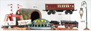 Konv. Spur 0, Tunnel, Brücke, Signalbrücke, einige Wagen, HWN, Uhrwerklok B klemmt ein wenig, Räder Zinkpest, kl. Schlepptenderlok ohne Tender, teilw. Bespielt, mit Fehlern, teilw. Gut, teilw. Stärker bespielt