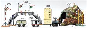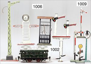 4 Teile Zubehör, 2-armiges Flügelsignal, nicht komplett, Fehler am Sockel, 2 x Richtungsanzeiger, 1 x mit Uhr, 1 Lampenmast, Lampenschirm und Birne fehlt, bespielt