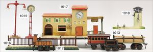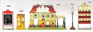 BING Bahnhof, mit Bahnsteigüberdachung, seitl. Kiosk, mit Sitzgruppe, passend zu Spur 0, leicht bespielt, gut