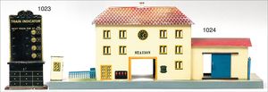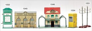 kl. Bahnhofsgebäude, wohl JEP, Frankreich, Blech handlackiert, Sockel wohl farbl. ausgebessert, 25,5 cm breit, Mitteldurchgang, 2 Bahnsteig-Überdachungen, Karre orig.?