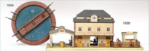 KIBRI kl. Bahnhof, 34,5 cm breit, 14,5 cm tief, 17 cm hoch, Durchgang, Zeitungsverkauf, Turmteil mit Uhr, Kassenhäuschen mit Überdachung, bespielt, teils altersbed. Lackfehler