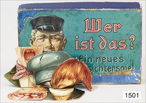 Spiel, "Wer ist das?, Ein neues Gesichterspiel", um 1900, Legekarten Presspappe, zum Erstellen von Gesichtern, auf Vollständigkeit nicht überprüft, Orig.-Kart., Deckbild verschlissen