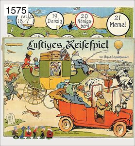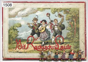 Brettspiel, Verlag J. W. Spear & Söhne, Nürnberg. Doos, um 1900, "Mit Rucksack und Laute", 6 halbplastische Zinnfiguren, 4-teiliges Spielbrett, 2 Würfel, mit Anleitung, Orig.-Kart. mit bunt lithogr. Deckbild, 1 Lasche am Kart. liegt lose bei, sonst gut, wohl weitgehend kompl.