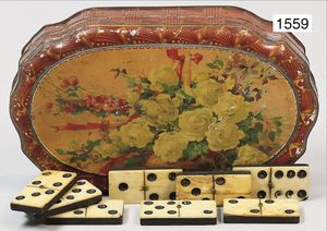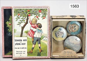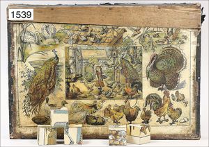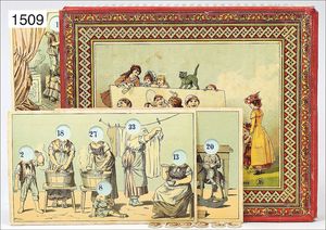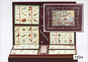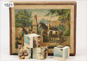 Würfel-Legespiel, mit 5 Bildtafeln, Deckblatt auf dem Orig.-Kart., Spielszenen, Orig.-Holzkiste, 1 Ecke ergänzt, altersbed. verschlissen, um 1900