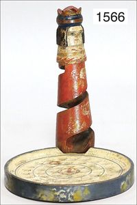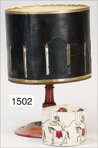 Bewegungsspiel, mit 19 Papierstreifen, 33 cm hoch, Durchm. 22 cm, Papierstreifen handkoloriert, ca. 1870, museal
