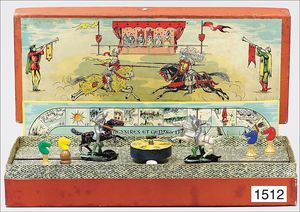 Spiel, Frankreich, "Le Tournoi", wohl 20er Jahre, Brettspiel, 2 Zinnreiter auf Pferd mit Lanze, Mechanik mit Federzug, 50 cm lang, 21 cm tief, ausgef., mit Anleitung, Orig.-Kart., mit bunt lithogr. Deckbild, schöner Orig.-Zust.