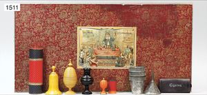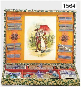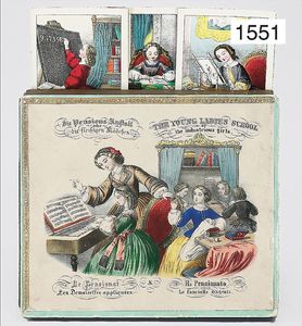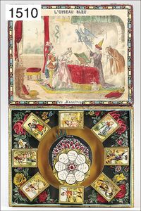 BIEDERMEIER Zauberkasten, Frankreich, Magnetspiel mit Sprüchen, aufwendig gestalteter Orig.-Kart., mit kl. bunt lithogr. Schachteln (Spielszenen), darin Sprüche, kreisender Rabe unter Glasplatte, durch Magnetscheibe angetrieben, Orig.-Kart., handkoloriert, museal, nahezu unberührter Orig.-Zust., ausgef.