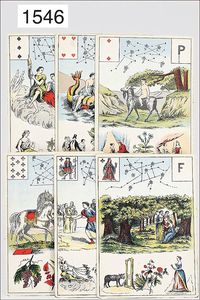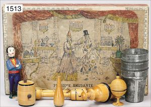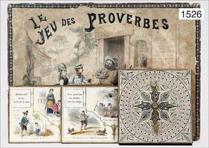 BIEDERMEIER Spiel, "Le Jeu des Proverbes", Frankreich, Watilliaux Editeur Paris, 18 Bildtafeln, handkoloriert, Drehscheibe, mit Bein-Einsteckteilen, Orig.-Kart. mit handkoloriertem Deckbild, ländliche Szene, altersbed. verschlissen, Seitenlaschen am Deckbild fehlen