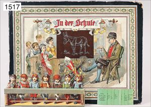 Spiel "In der Schule", deutsch, um 1900, Aufklappfiguren, mit Fragekarten, mit Anleitung, Orig.-Kart. mit bunt lithogr. Deckbild, 33,5 cm x 26 cm, Kart. am Rand etwas verschlissen, sonst schöner Orig.-Zust.