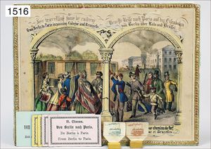 Spiel, deutsch, ca. 1850, Brettspiel, "Neueste Reise nach Paris auf der Eisenbahn, von Berlin über Köln und Brüssel", mit Spruchkarten, sowie 3 Spielsteine in Form einer aufgedruckten Eisenbahn, ohne Anleitung, Orig.-Kart., mit handkoloriertem Deckbild, 2 Laschen am Kart. fehlen, Schrift 4-sprachig, 25 cm x 18 cm, ausgef.