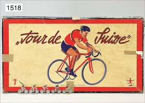 Brettspiel, "Tour de Suisse", Fahrradspiel, wohl 30er Jahre, 16 Zinn-Fahrräder, mit Anleitung, Kart. altersbed. verschlissen, seitl. Klebestreife