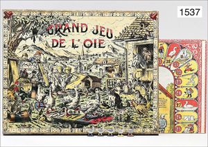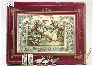 Spiel, "Grand jeu de L´oie", Frankreich, Brettspiel, 4-teilig, mit 5 Zinn-Gänsen, Spieltafeln und 2 Bein-Würfeln, Anleitung auf dem Spielfeld auflithogr., im Orig.-Kart., mit bunt lithogr. Deckbild, um 1900