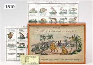 BIEDERMEIER "Neues Zoologisches Lottospiel, 10 handkolorierte Bildtafeln, 3-sprachig beschriftet, mit kl. Schriftkarten, Orig.-Holzkiste, Deckbild handkoloriert