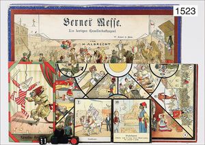 "Berner Messe", von H. Albrecht, 2-teiliges Brettspiel, Spielkarten, Würfel, Anleitung verschlissen, Orig.-Kart., mit bunt lithogr. Deckbild, vor 1900, 37,5 cm x 20 cm