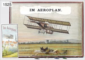 Spiel, "Im Aeroplan", 4-teliges Brettspiel, an der Knickstelle gerissen, 5 Flugapparate, 1 fehlt, 6 Spielschalen mit Spielgeld und Anleitung, Orig.-Kart., bunt lithogr. Deckbild, 42 cm x 31,5 cm