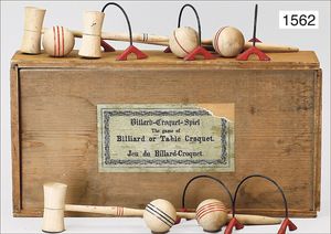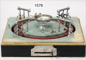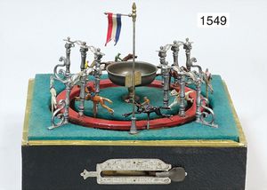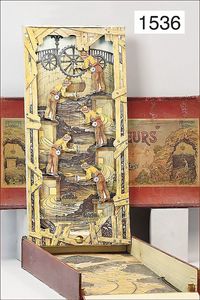 Kugelspiel, "Jeu des Mineurs", Frankreich, Spiel zum Aufklappen, mit sich bewegenden Figuren im Bergwerk, Holz/Pappe, mit lithogr. Papier beklebt, 65 cm hoch, 61 cm tief, im Orig.-Kart., mit bunt lithogr. Deckbild, ausgef.