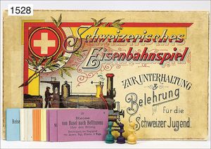 Spiel, "Schweizerisches Eisenbahnspiel", um 1900, 8-teiliges Brettspiel, mit Figuren, Würfeln und Karten, Orig.-Kart., mit bunt lithogr. Deckbild, Seitenlaschen am Deckel fehlen