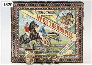 Wettrennspiel, "Course de Chevaux", mit 6 Zinn-Springreitern, 8-teiliges Brettspiel, Würfel, Würfelbecher, ohne Anleitung, Orig.-Kart. mit lithogr. Deckbild, Fuss an einer Figur fehlt, 1 Figur Fuß geklebt