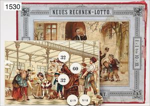 Spiel, "Neues Rechen-Lotto, 1 x 1 bis 10 x 10", 9 Bildtafeln, im Orig.-Kart., seitl. getaped, bunt lithogr. Deckbild, um 1900
