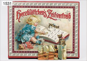 "Herzblättchen´s Zeitvertreib", Rechenspiel, mit Zahlentafeln und Bildtafeln, ca. 1910, mit Anleitung, Orig.-Kart., bunt lithogr. Deckbild, Spielszene, Kind, Puppe und Katzen, gem. J. W. S & S Bavaria