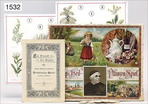 "Kneipp´s Heil-Pflanzen-Spiel", 12 Tafeln mit botanischen Motiven, dazu runde Zahlenspielsteine, mit Beschriftung, wohl weitgehend kompl., Orig.-Kart. mit bunt lithogr. Deckbild, Orig.-Anleitung, Kart. am Rand verschlissen, 1 Lasche seitl. fehlt, um 1900