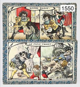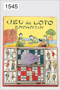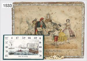LOTO ENFANTIN JEU AMUSANT, Spiel, um 1900, Orig.-Kart. mit bunt lithogr. Deckblatt, ohne Anleitung, wohl weitgehend kompl.