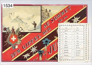 Spiel, "Zum Gipfel der Jungfrau", 6-teiliges Brettspiel mit 4 Tafeln, 2 kl. Zinnfiguren, 1 Fuss fehlt, mit Anleitung, kompl.?, Orig.-Kart. mit bunt lithogr. Deckbild