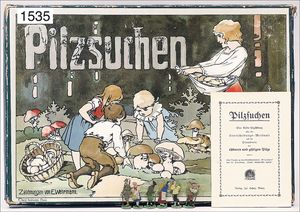 Spiel, "Pilzsuchen", Verlag Jos. Scholz Mainz, Zeichnungen von E. Wehrmann, Brettspiel, 4-teilig, mit 6 Zinnfiguren, Orig.-Spielanleitung, ca. 1915, Orig.-Kart., bunt lithogr. Deckbild, Kart. am Rand altersbed. etwas verschlissen