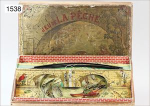 Angelspiel, Frankreich, "JEU DE LA PÊCHE", See in Form einer sich drehenden Scheibe, Brücke, Uhrwerkantrieb, mit Musikspielwerk, mit Fischen, im Orig.-Kart., bunt lithogr. Deckbild, Kart. außen etwas verschlissen, um 1900, selten, mit Anleitung