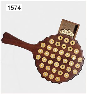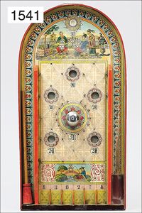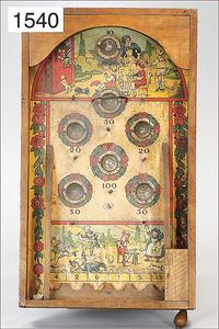 Kugelspiel, um 1900, asiatisches Motiv, Holz mit bunt lithogr. Papier beklebt, 41 cm lang, 22 cm breit, guter Zust.