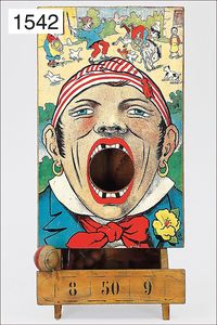 Wurfspiel, Holz mit bunt lithogr. Papier beklebt, ca. 1910, 41 cm hoch, 19,5 cm breit, guter Zust.