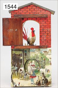 Wurfspiel, Holz, mit lithogr. Papier beklebt, 36 cm, Tür öffnet sich, Hahn schwängt heraus, mit Stimme