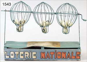 "Loterie Nationale", Presspappe, Papier beklebt, 3 Drahtkörbe mit Celluloidbällen, um 1900, Frankreich, 30 cm breit, 23 cm hoch
