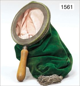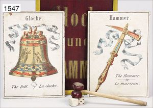 Spiel, "Glocke und Hammer", um 1850, 5 Spielkarten, Hammer, Steinwürfel, Anleitung verschlissen, kl. Stück am Rand fehlt, Orig.-Holzkiste