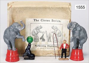 "The Circus series", im Orig.-Kart., 2 Elefanten, 1 Robbe, mit Ball, 1 Zirkusdirektor, 2 Trommeln, guter Zust., 14 cm x 17 cm
