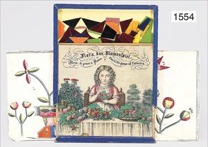 "Flora, das Blumenspiel", auf deutsch, französisch und englisch, handkoloriert, BIEDERMEIER, Legespiel mit versch. Mosaikblumen, wohl kompl., im Orig.-Holzbox, 16 cm x 16 cm