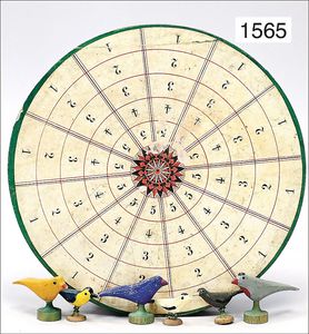 Vogelspiel, mit ERZGEBIRGE-Vögeln, drehende Scheibe mit Zahlen, Durchm. 23 cm, ohne Anleitung, früh