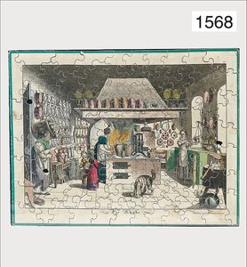 frühes Puzzle, ca. 1860, Motiv: Die Küche (Rauchfangküche), 30 cm x 23,5 cm, außergew. Darstellung, 3 kl. Fehlstellen, gerahmt